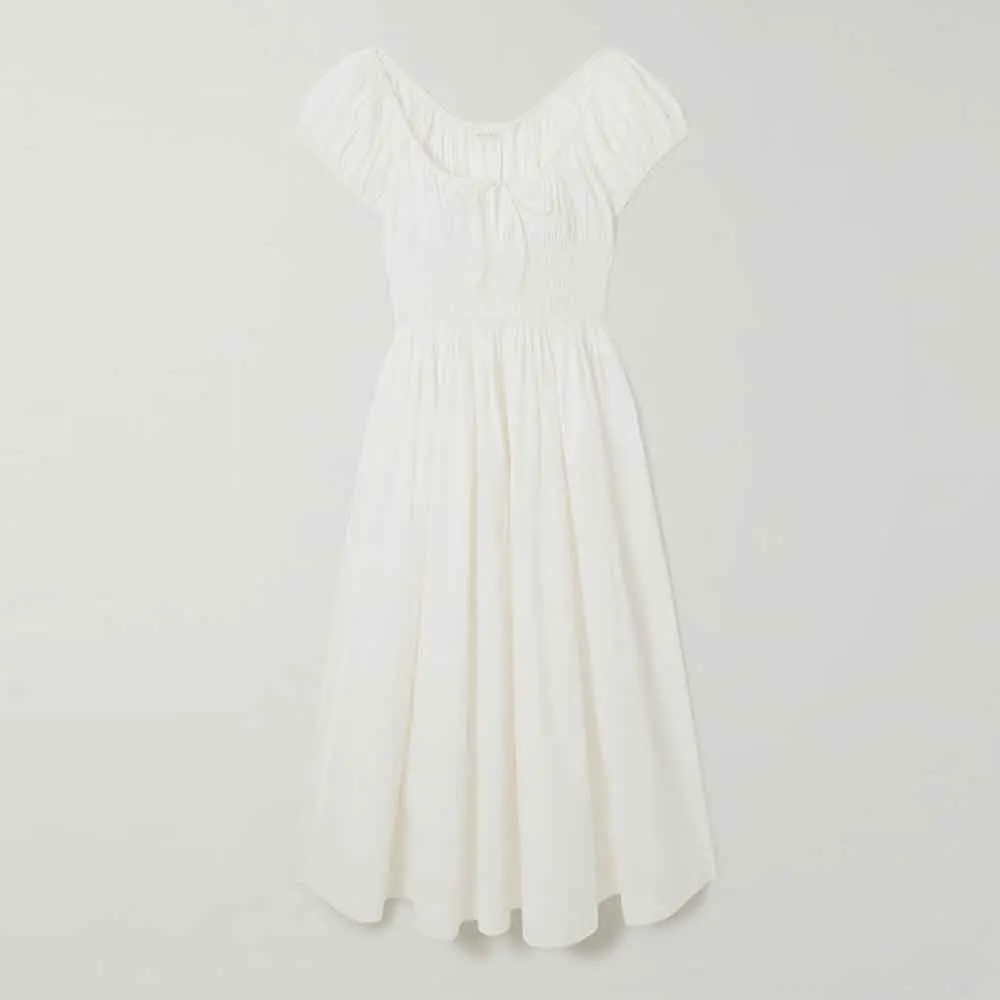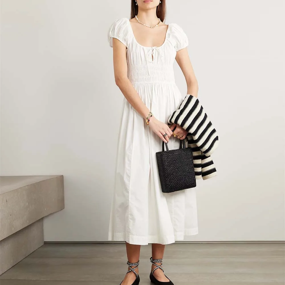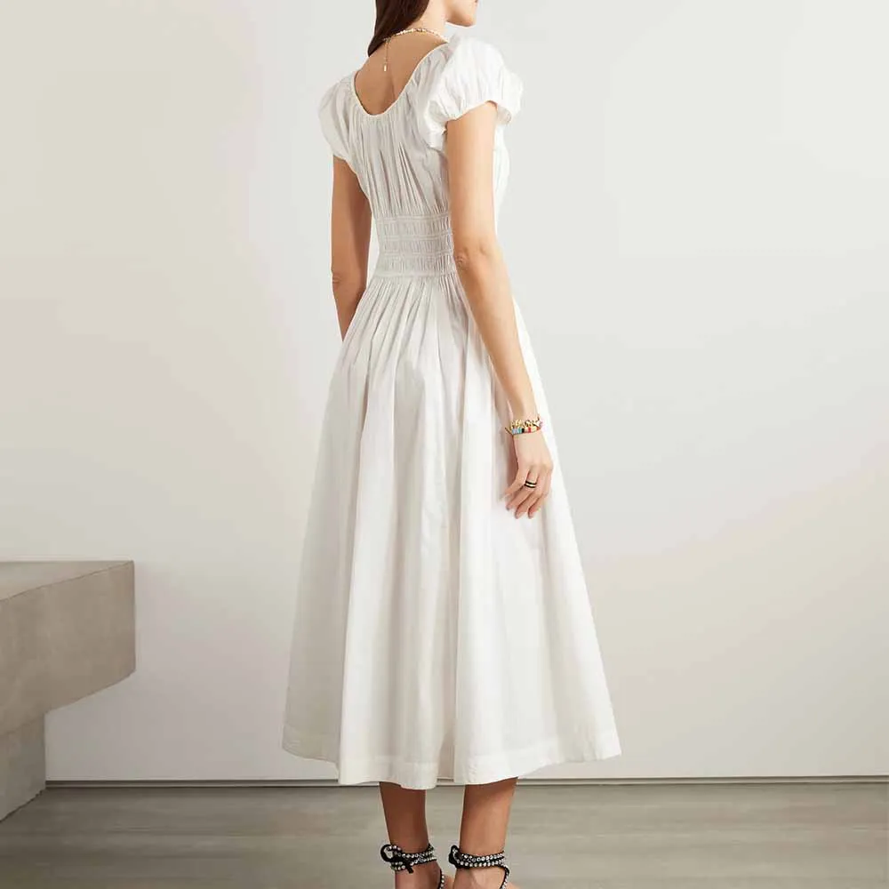 Clothing Manufacturers Custom Spring Summer Autumn Short Sleeve Tie-detail Shirred Elastic Waist Poplin Midi Dress